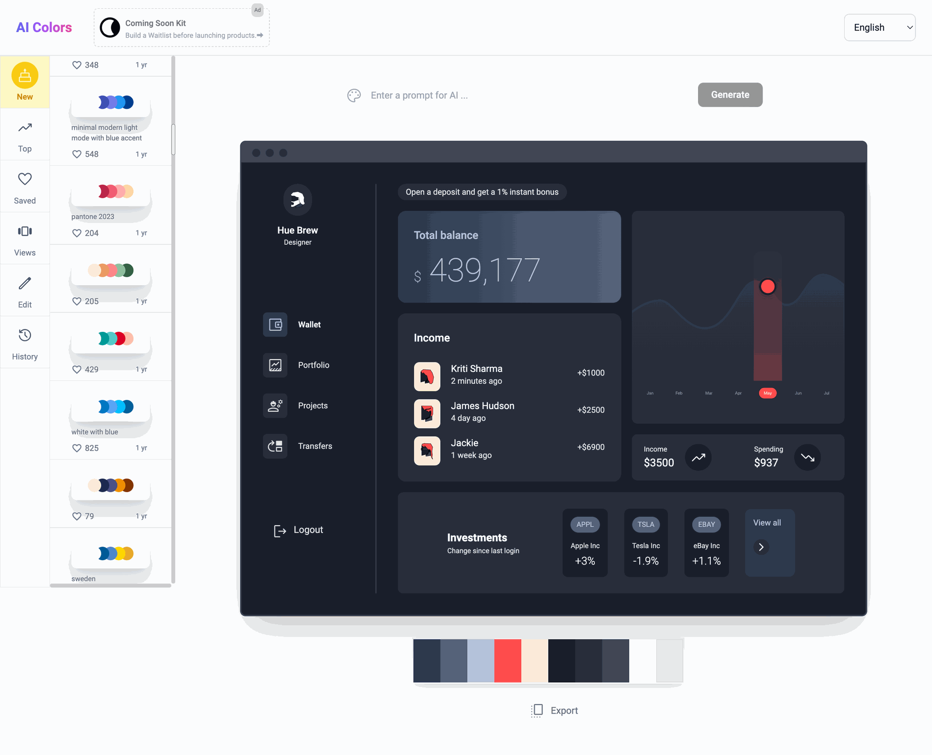 AI Color Palette Generator AI-powered palette helps you create consistent, attractive, and appropriate color palettes to get the best color combination for your projects by editing them. In turn, the pre-generated palettes are a great starting point for those moments of creative blocks where you don't know where to start.